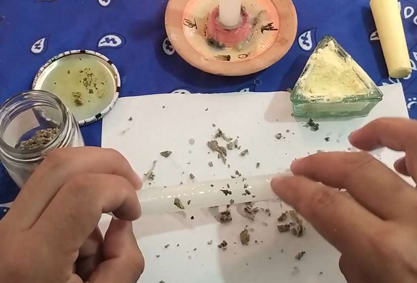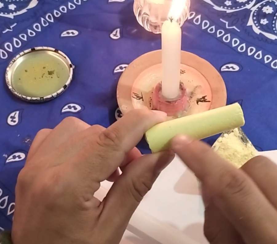 Ahora enciende la vela blanca. Luego de esto deberás tener cerca de nosotros todos los ingredientes, ahora vamos a tomar el mondadientes y la vela blanca y dibujaremos tres cruces en la zona media de la vela, luego vas a dibujar bajo las velas la figura del azufre.
