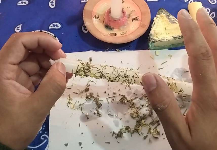 para hacer esto deberemos tener aceite de oliva, salvia blanca, romero, dos velas blancas, un mondadientes y un poco de azufre en polvo